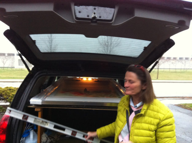Transporting big poppy print to gallery show. This was a feat in and of itself. The big poppy framed print is one of the largest printed pieces of Scribbleography artwork that has been hung in a show. At almost 6 feet long this panoramic image just fit in the SUV.